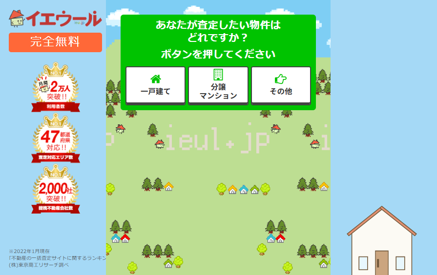 公式サイト(ieul.jp)にアクセスし、売却したい物件の住所(または郵便番号)と物件種別を入力します。この段階では個人情報の入力は不要です。